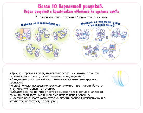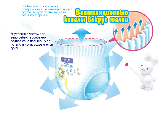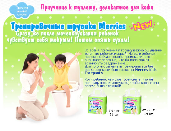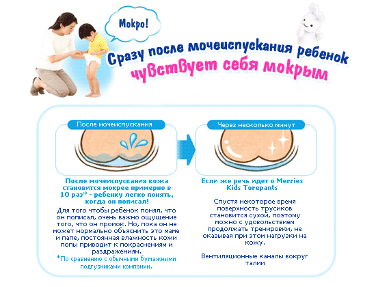 Для того чтобы начать тренироваться без вреда для кожи были созданы Merries Kids Torepants. - Тренировочные трусики Merries дают ощущение влажности, для того чтобы ребенок понял, что он пописал, но, спустя некоторое время поверхность трусиков становится сухой, поэтому можно с удовольствием продолжать тренировки, не оказывая при этом нагрузки на кожу.